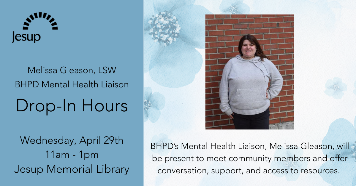 On the second and last Wednesdays of the month, BHPD’s Mental Health Liaison Melissa Gleason, LSW, will be present at the library to offer conversation, support, and access to resources. The purpose of these drop-in hours is to offer outreach to individuals in a comfortable atmosphere. connect people to services, raise awareness, and work to identify gaps in meeting peoples’ needs.