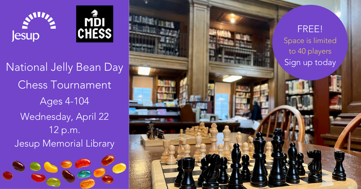 A free-to-enter, all ages chess tournament organized by MDI Chess and the Jesup Memorial Library. Beginner friendly; if you know how the pieces move, this tournament is for you! Contact the Tournament Director Dan Monahan (mdichess1@gmail.com / 207-200-4681) or the Jesup Children’s Librarian Abby Morrow (amorrow@jesuplibrary.org / 207-288-4245) with questions or for help registering.