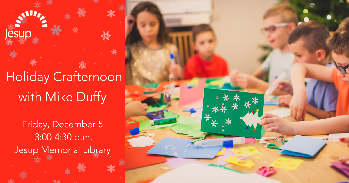 Join us on Friday, December 5 from 3:00 to 4:30 p.m. for a crafty afternoon with local artist, Mike Duffy! Children of all ages are welcome to attend. We ask that children in grade 2 and under are accompanied by an adult who can help out with the activity. All materials will be provided. Space is limited. Please contact Abby if you have any questions: amorrow@jesuplibrary.org