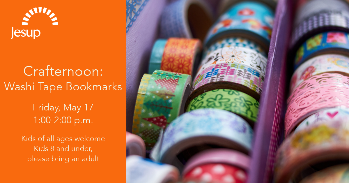 Join us on Friday, May 17 from 1:00 to 2:00 p.m. to create bookmarks with washi tape. Children of all ages are welcome to attend. We ask that children ages 8 and under are accompanied by an adult. All materials will be provided. Please contact Abby if you have any questions: amorrow@jesuplibrary.org