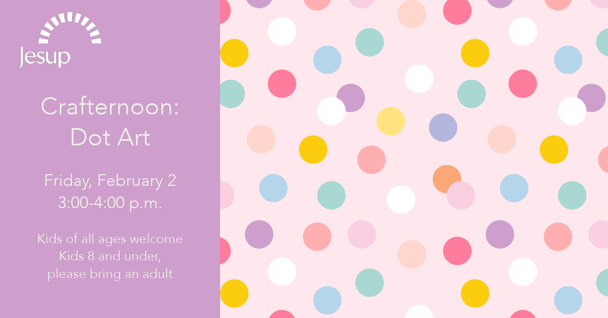Join us on Friday, February 2 from 3:00 to 4:00 p.m. to make dot art. Children of all ages are welcome to attend. We ask that children ages 8 and under are accompanied by an adult. All materials will be provided. Please contact Abby if you have any questions: amorrow@jesuplibrary.org