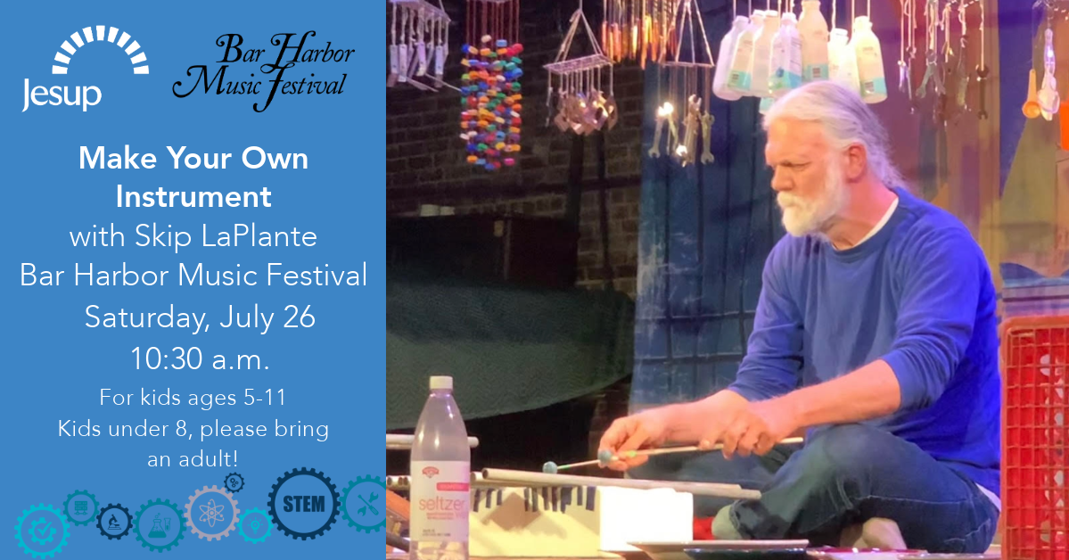 Join Skip LaPlante of the Bar Harbor Music Festival to make your own instrument from recycled materials! This program is recommended for ages 5-11. Kids under 8 are asked to bring an adult.