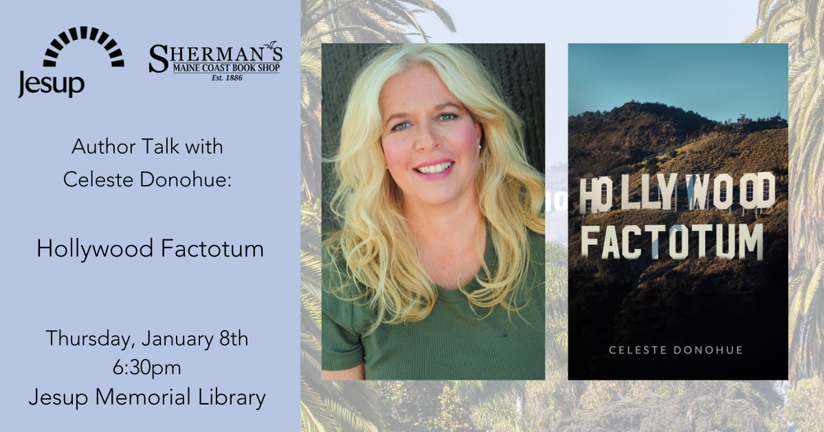 On Thursday, January 8th, 2026 at 6:30pm, Celeste Donohue will appear at the Jesup Memorial Library for an author talk on Hollywood Factotum, released in November 2025. This program is offered online and in-person.