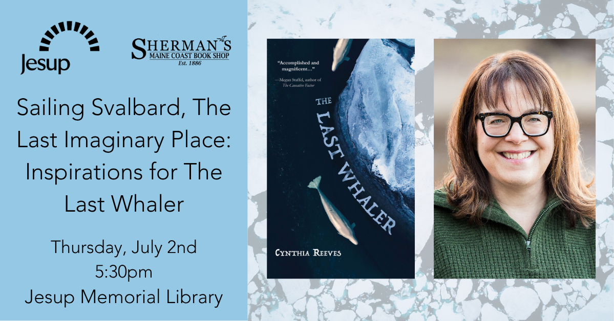 Have you ever dreamed of sailing along Arctic shores, witnessing the unspoiled beauty of the massive glaciers or the spectacle of a glacier calving? Or navigating ice fields so thick that only an icebreaker can make its way through? Join the Jesup Library on Thursday, July 2nd at 5:30pm for a a presentation by Cynthia Reeves, a Maine novelist who will share highlights of her Arctic travels and inspirations for her latest novel, The Last Whaler.