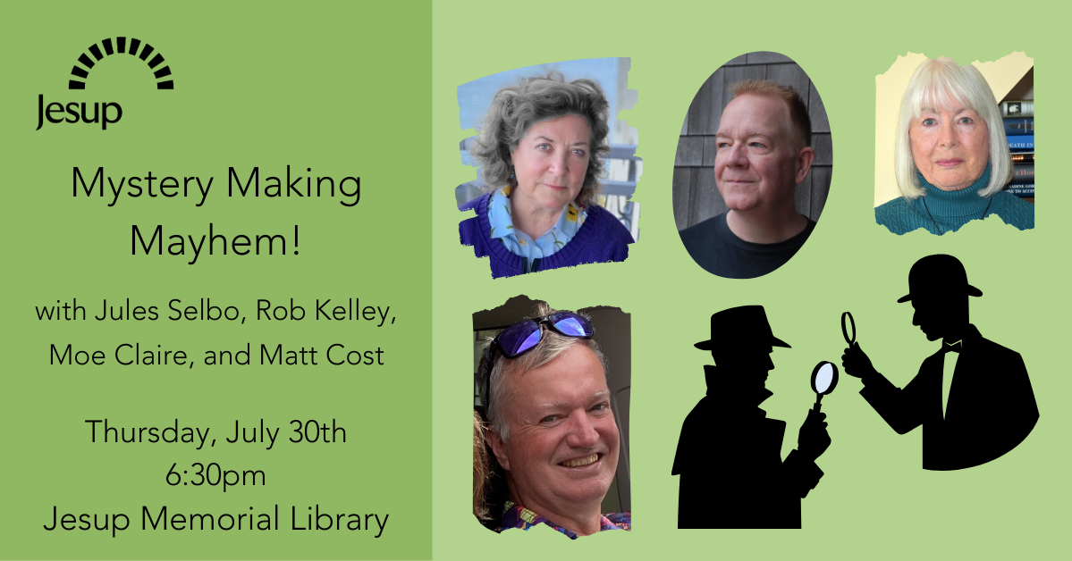 On Thursday, July 30th, mystery authors Jule Selbo, Rob Kelley, Moe Claire, and Matt Cost will work together with the audience to create a mystery on the spot! Attendees will be asked to fill out five slips of paper upon entering the library including a character name, possible occupations, a setting for the mystery, a weapon that was used, and the motive for the murder. Yes, there will be a murder. These slips of paper will be dropped into the corresponding bag for the authors to pull from and create a mystery, with audience participation, creating a mystery from scratch from beginning to end. The authors will share insights into their processes throughout the program.