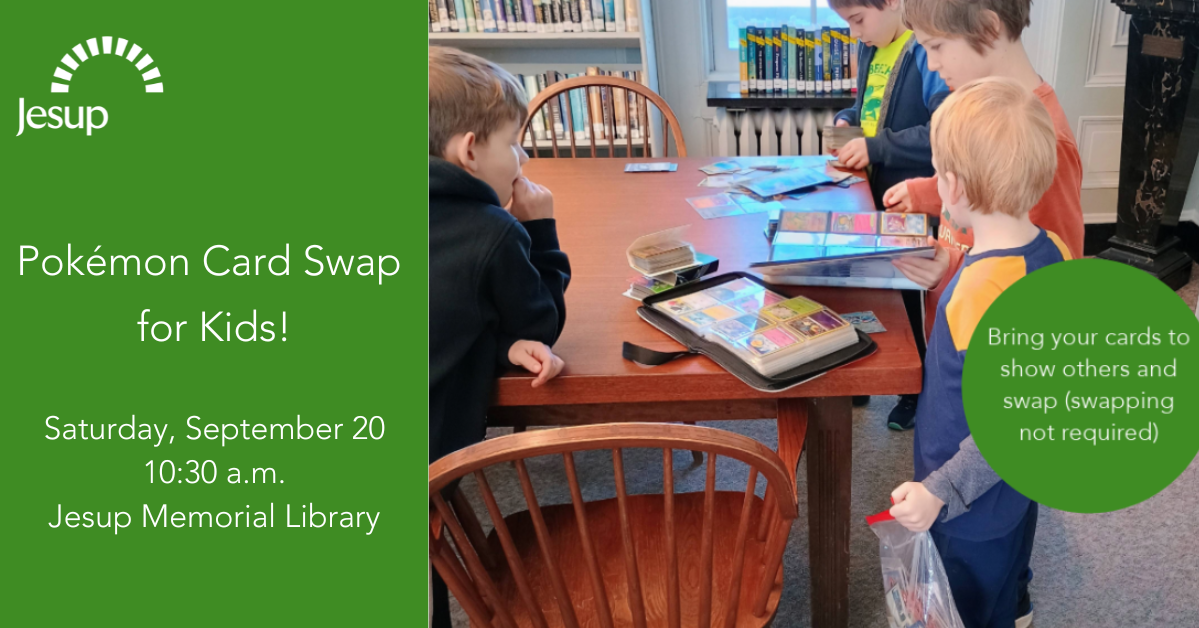 Join us for a Pokémon card swap and share your love of the game with other kids in our community. Children should bring their own cards to trade with or to show off to other children. Parents/caregivers should plan to stay if they wish to supervise and oversee trades.