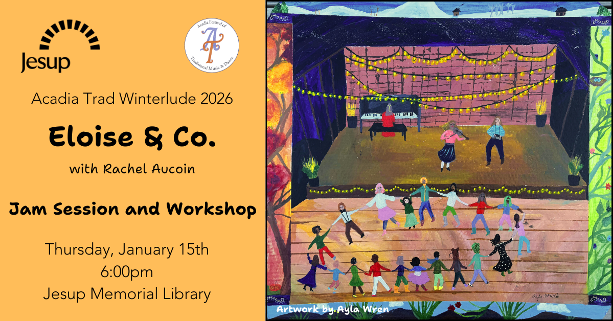 Vermont-based band Eloise & Co. with Rachel Aucoin will appear at the Jesup on Thursday, January 15th for a public workshop and jam session. This event is part of the Acadia Festival of Traditional Music and Dance’s 2026 Winterlude, a two-day artistic residency which includes school visits and an evening concert and dance. This year’s public events include this evening workshop and open jam at the Jesup, and a concert and bal folk dance at College of the Atlantic (Gates Auditorium) on Friday, January 16th at 7:00pm (doors open 6:30pm).